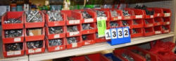 Nut and bolt bin organizer with contents consisting of brass hose fittings, nut and bolts, etc.