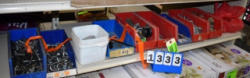 Nut and bolt bin organizer with contents of nuts, bolts, nails, washers, etc.