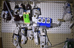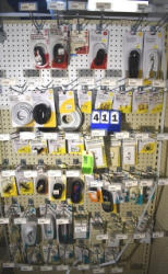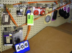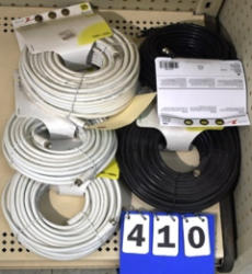Peg board lot consisting of fiber optic cable, stereo/audio cable, coaxial cable, coax cable ends, Ts, phone cables, adapters