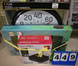 Lot consisting of a Sound Flow Wireless Dock, large thermometer and a terra cotta clock and thermometer