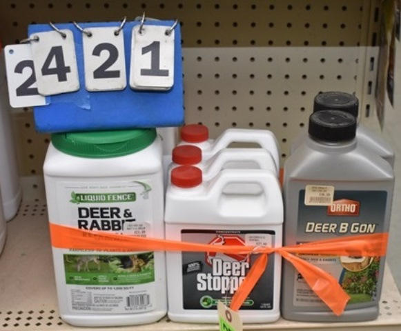 Lot of 7 assorted sized containers of Deer and Rabbit Repellent, Deer Be Gone and Deer Stopper