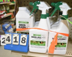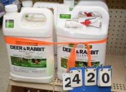 Lot of 7 assorted sized containers of Deer and Rabbit Repellent, Deer Be Gone and Deer Stopper