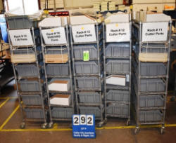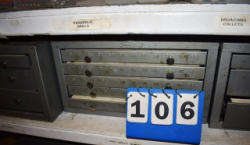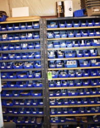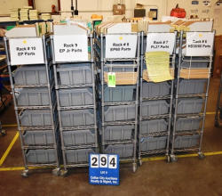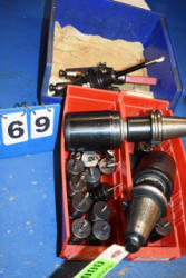 Lot of 6 Parts Bins with Various Machine Parts, Tool Holder Covers, Table Fixture Pins, Fadal Vise Parts, Etc.