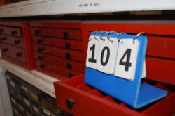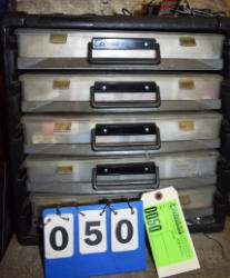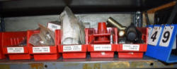 #49 - Lot of 6 Parts Bins with Various Machine Parts, Tool Holder Covers, Table Fixture Pins, Fadal Vise Parts, Etc.