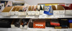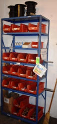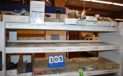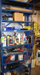 Shelving Unit with Contents Consisting of Lightbulbs, Stain, Rubber bands, Oils, Etc.