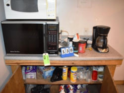 Lot Consisting of 6 1/2' Shelving Unit, Microwave, Stool, Scale, Shipping Station