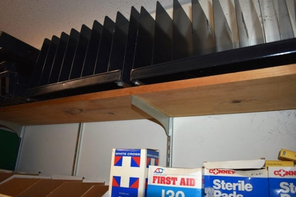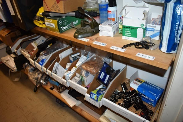 Large Closet Lot of Office Supplies, Cleaning Supplies Including Binder Clips, Lysol, Staplers, Sterile Pads, File Organizers, Etc.