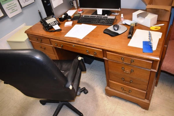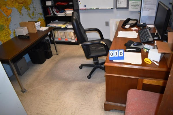 Office Lot Including Chairs, Wooden Desk Approx. 66"W, 54"W Table, Bookshelf, Filing Cabinet, Etc. (Computers/Monitors Not Included)