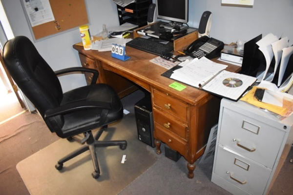Wooden Desk Approx. 60" W, 2 Drawer Filing Cabinet, Chair (Computers/Monitors Not Included In Lot)