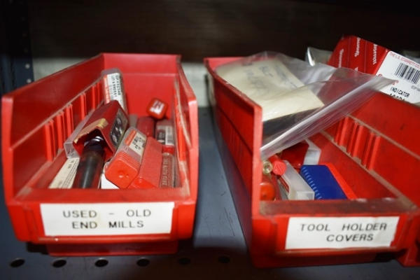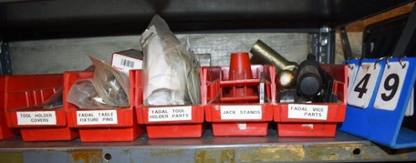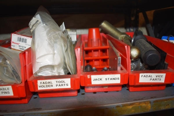 Lot of 6 Parts Bins with Various Machine Parts, Tool Holder Covers, Table Fixture Pins, Fadal Vise Parts, Etc.