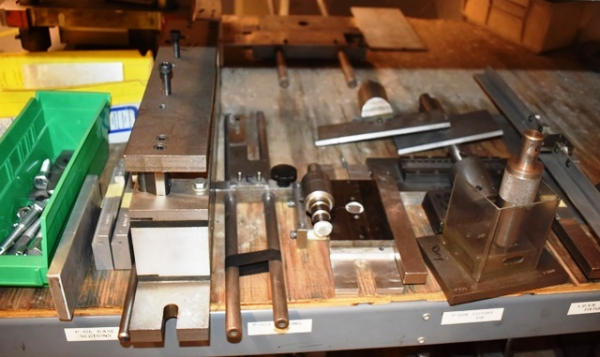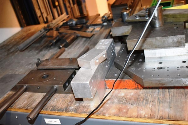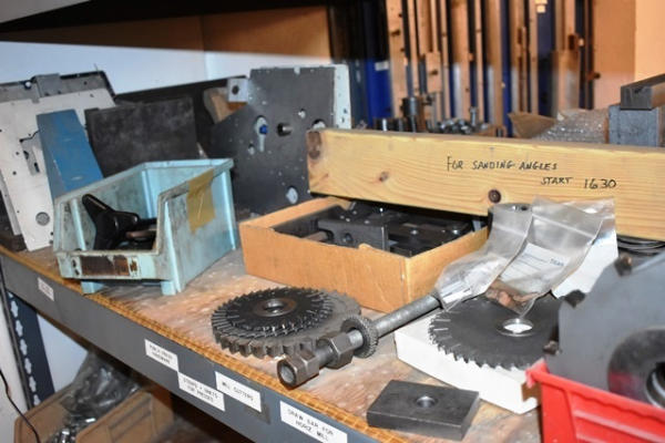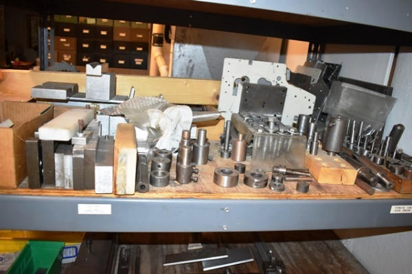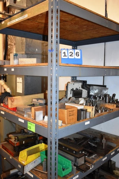 Shelving Unit with Contents Consisting of Mill Cutters, Misc. L Straps and Parallels , Vise Jaws, Etc. (Contents Included in Lot Limited To Top 4 Shelves ONLY, BOTTOM 2 SHELVES NOT INCLUDED!)