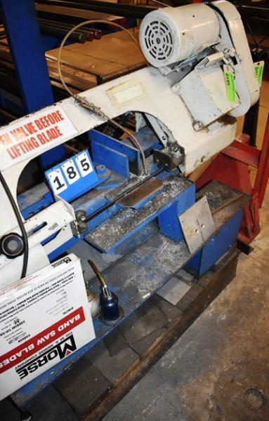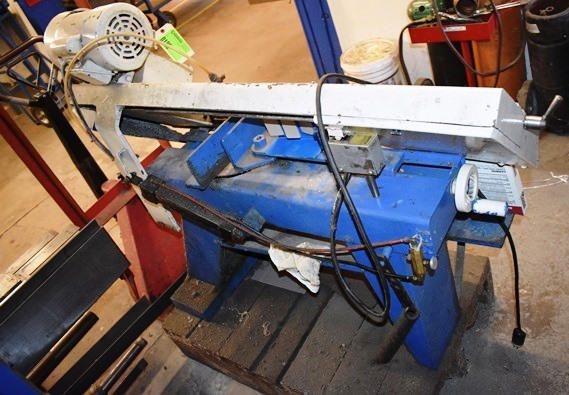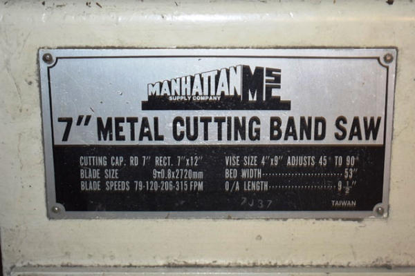 Manhattan Supply Company 7" Metal Cutting Band Saw, Vise Size 4"x9", Adjusts 45 Degrees to 90 Degrees, Bed Width 53", 110V. Onsite Exclusive Rigger will disassemble and load on your trailer for the following flat fee: $200.00. No other rigger is permitted onsite.