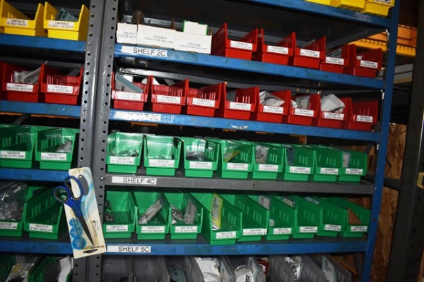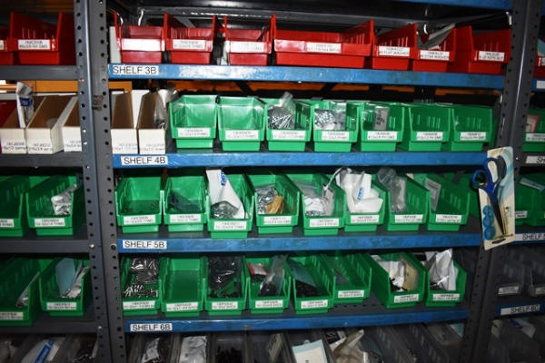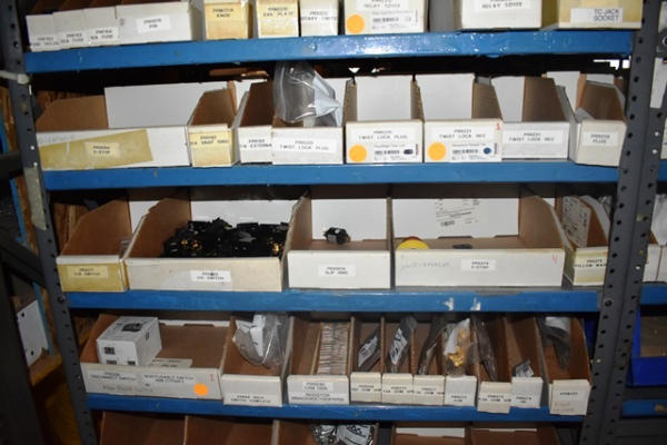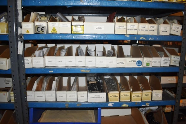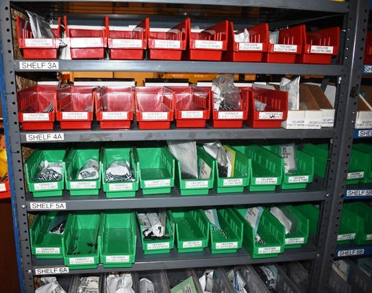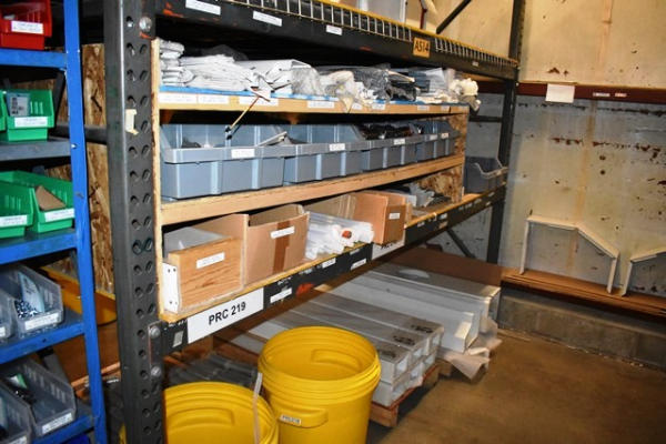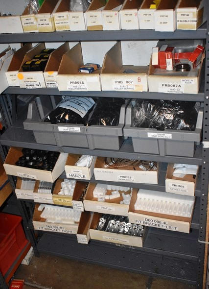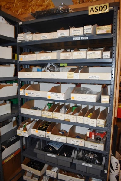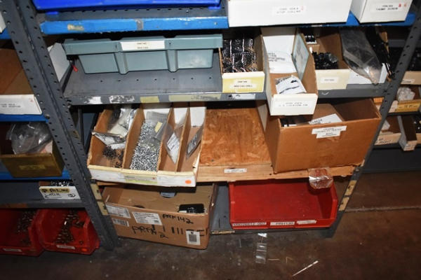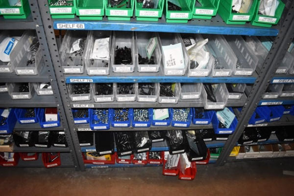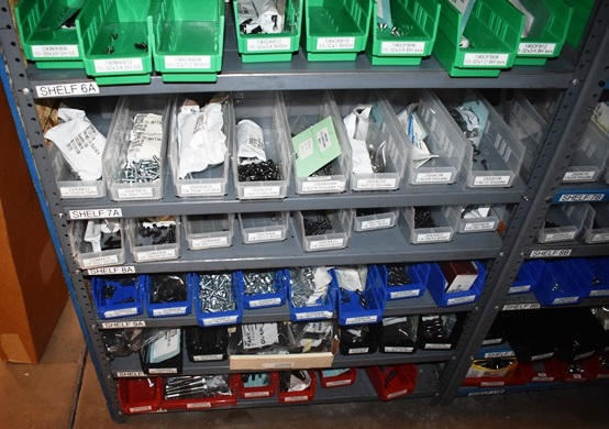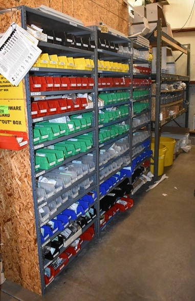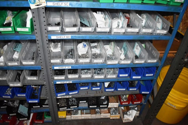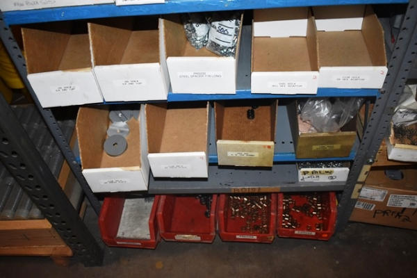 Shelving Unit and Pallet Rack Contents Consisting of Fan Guards, Bearings, Terminals, Spacers, Machine Bolts, Nuts, Machine Parts