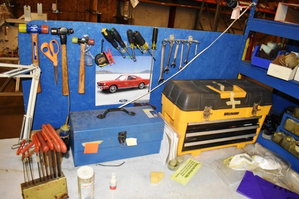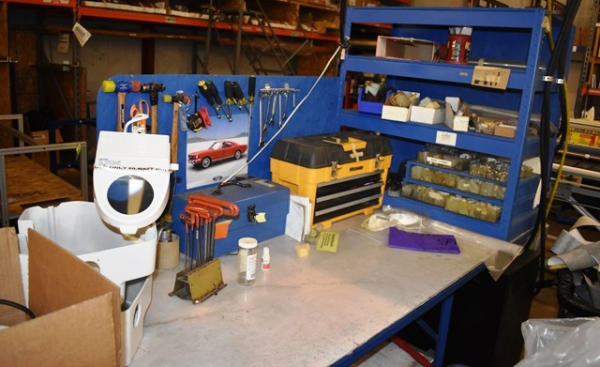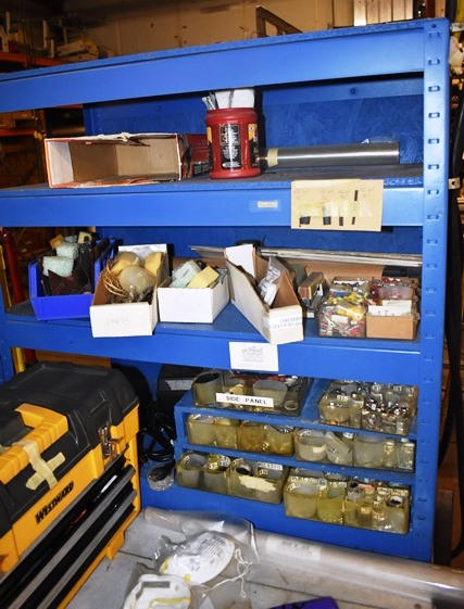 Large Workbench with Assorted Tools, Shelving Unit, Nuts, Bolts, Laminator Parts