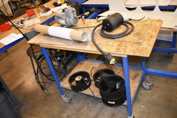 Lot of Assorted Sized Tables and Carts with Contents Consisting of Fans, Power Cords, Etc.