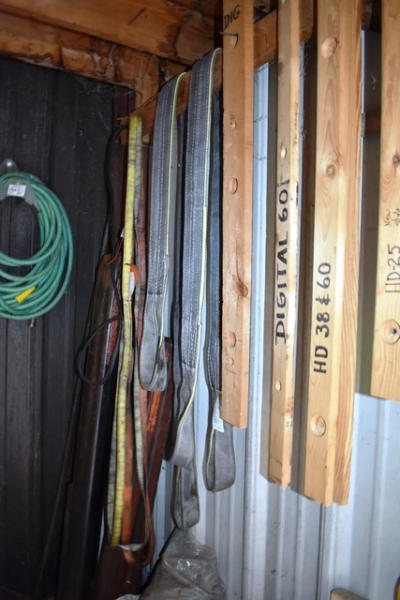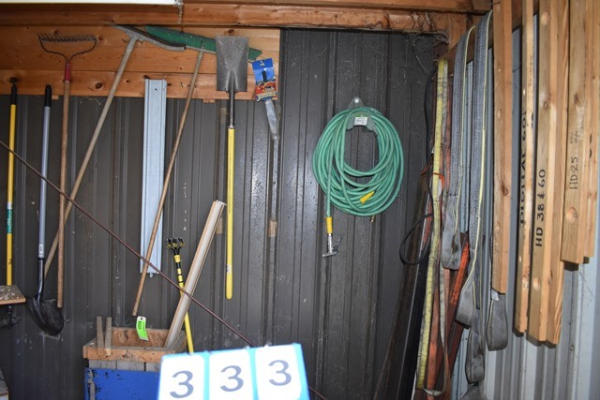 Lot of Assorted Shovels, Hoes, Rakes, Lifting Straps, Etc.