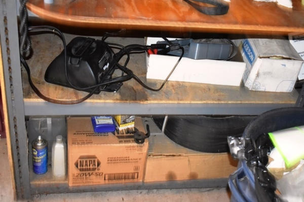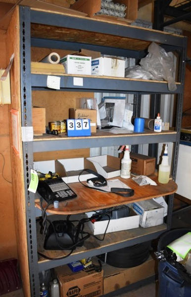 Shelving Unit with Contents Consisting of Lightbulbs, Stain, Rubber bands, Oils, Etc.