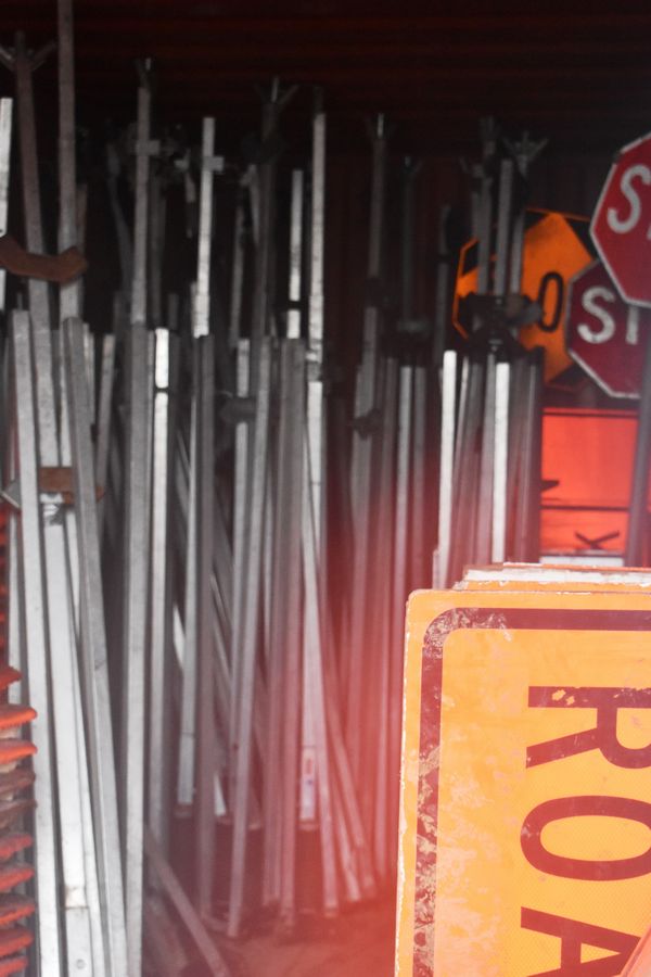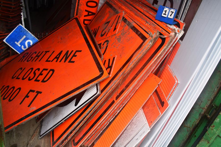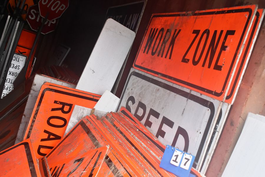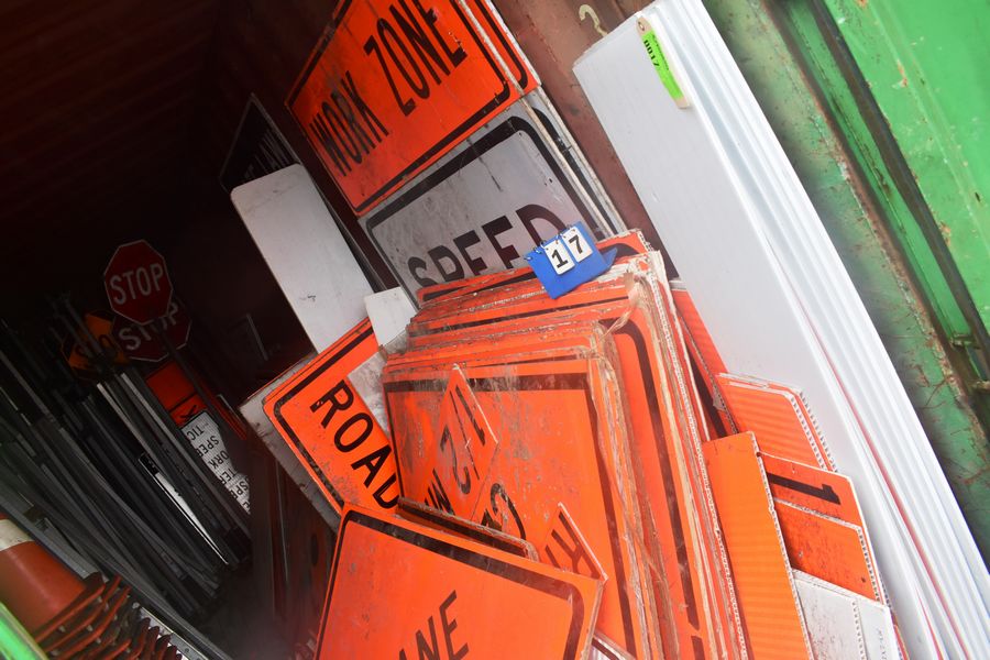 Lot of Signs and Sign Holders Including Right Lane Closed, Work Zone, Speed Limit Signs, Etc.