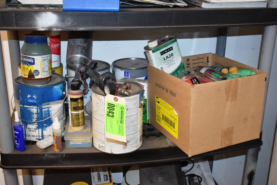 2 Shelf Lots with Paint, Spray Gun, Painting Accessories, Etc.