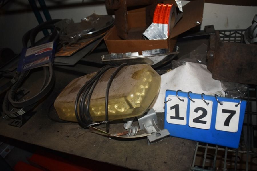 Shelf Lot Consisting of Caution Light, Fan Belts, Assorted Parts